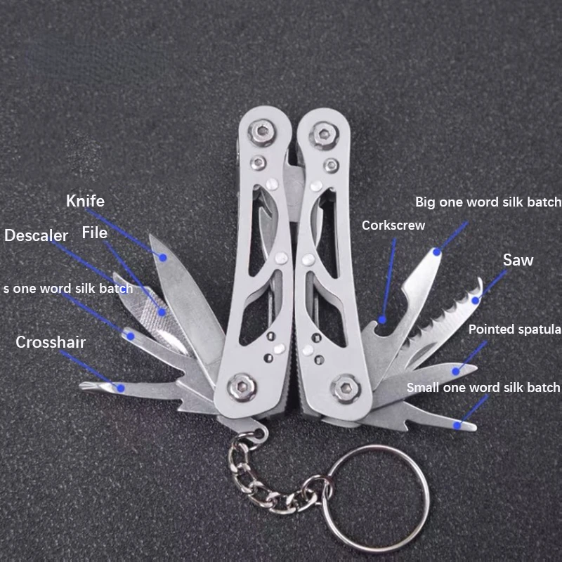 1.Pliers (needle-nose pliers, round pipe pliers, cutting pliers) 2.Knife3. Cross Screwdriver 4. Small Slotted Screwdriver 5. Fish Scale Knife 6. Detacher 7. Double-Sided File 8. Large Slotted Screwdriver 9. Scraper 10. Medium Slotted Screwdriver 11. Can Opener 12. Bottle Opener